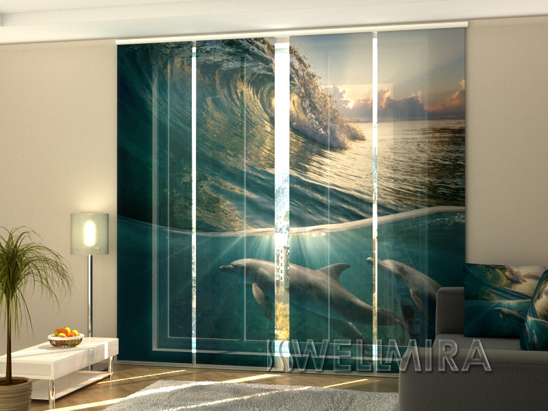 Set of 4 Panel Curtains Dolphins and Wave