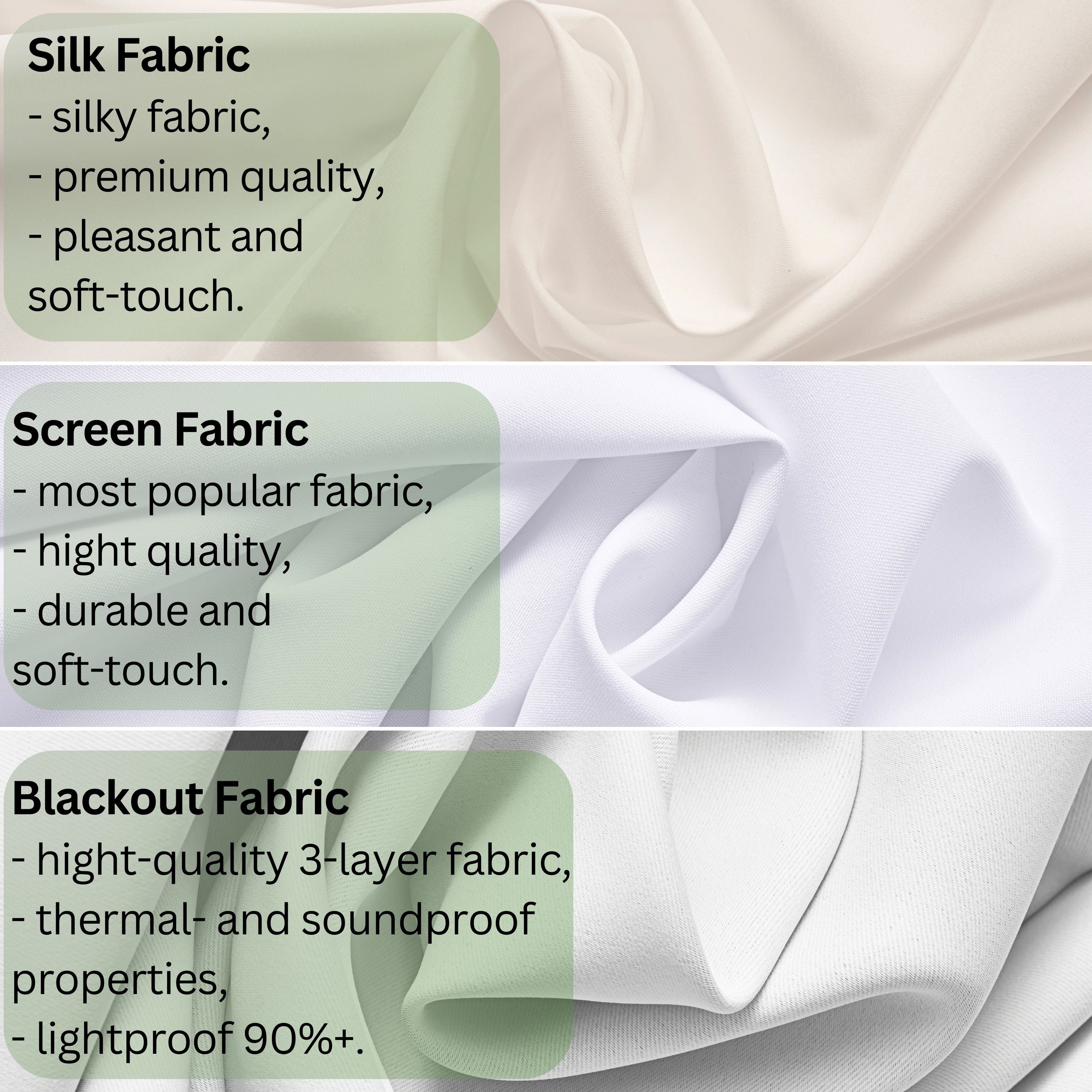 Blackout - it is a dense fabric that has opaque, lightproof, soundproof, and term-proof properties. If you want to create semi-darkness in the room on a sunny day, the curtains made out of blackout fabric will help you with that. Pictures come to life and give dimensions to the room on this fabric. Panel Curtains made of Screen are also suitable for dividing a space or covering a space you want to hide.
